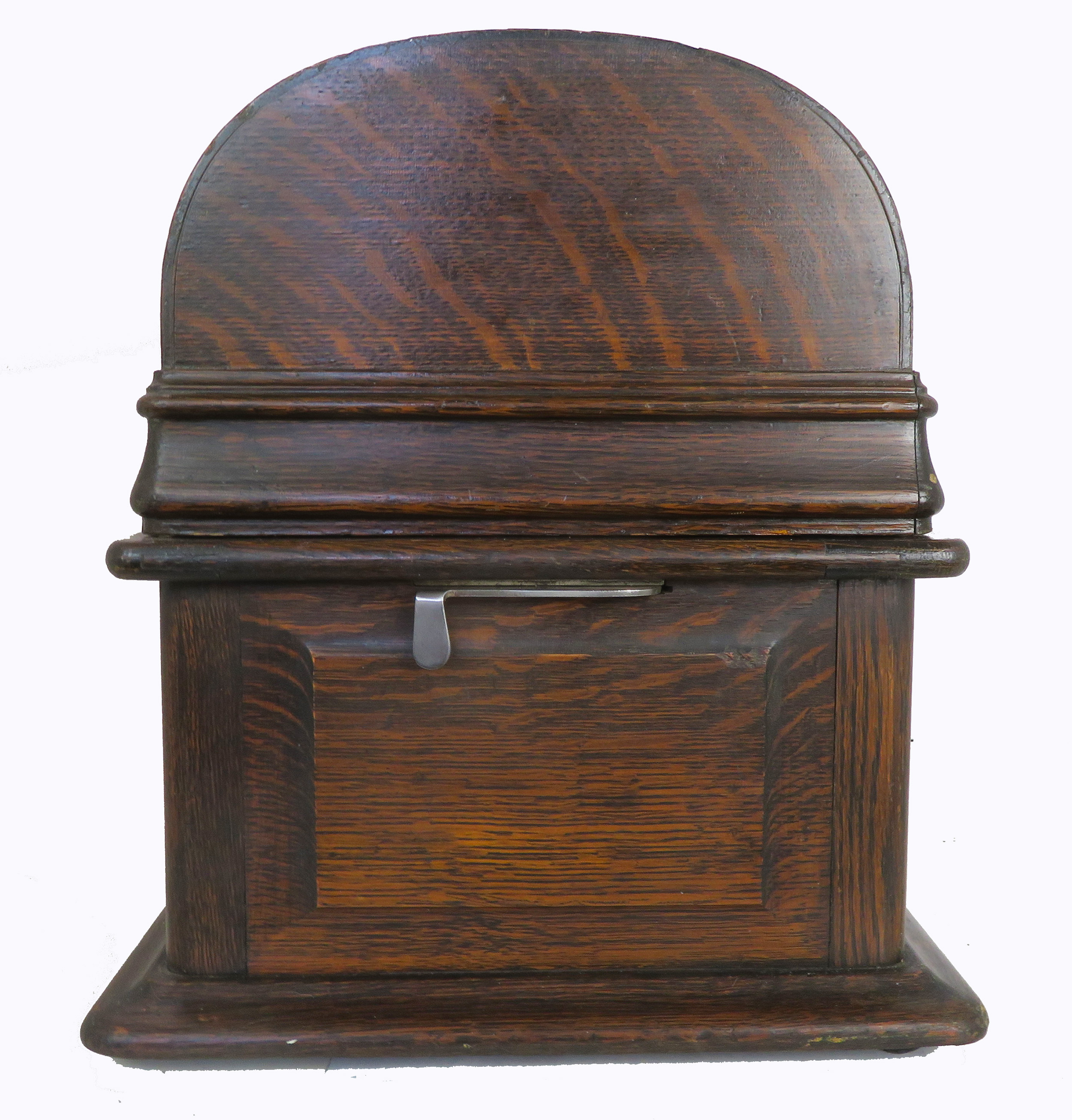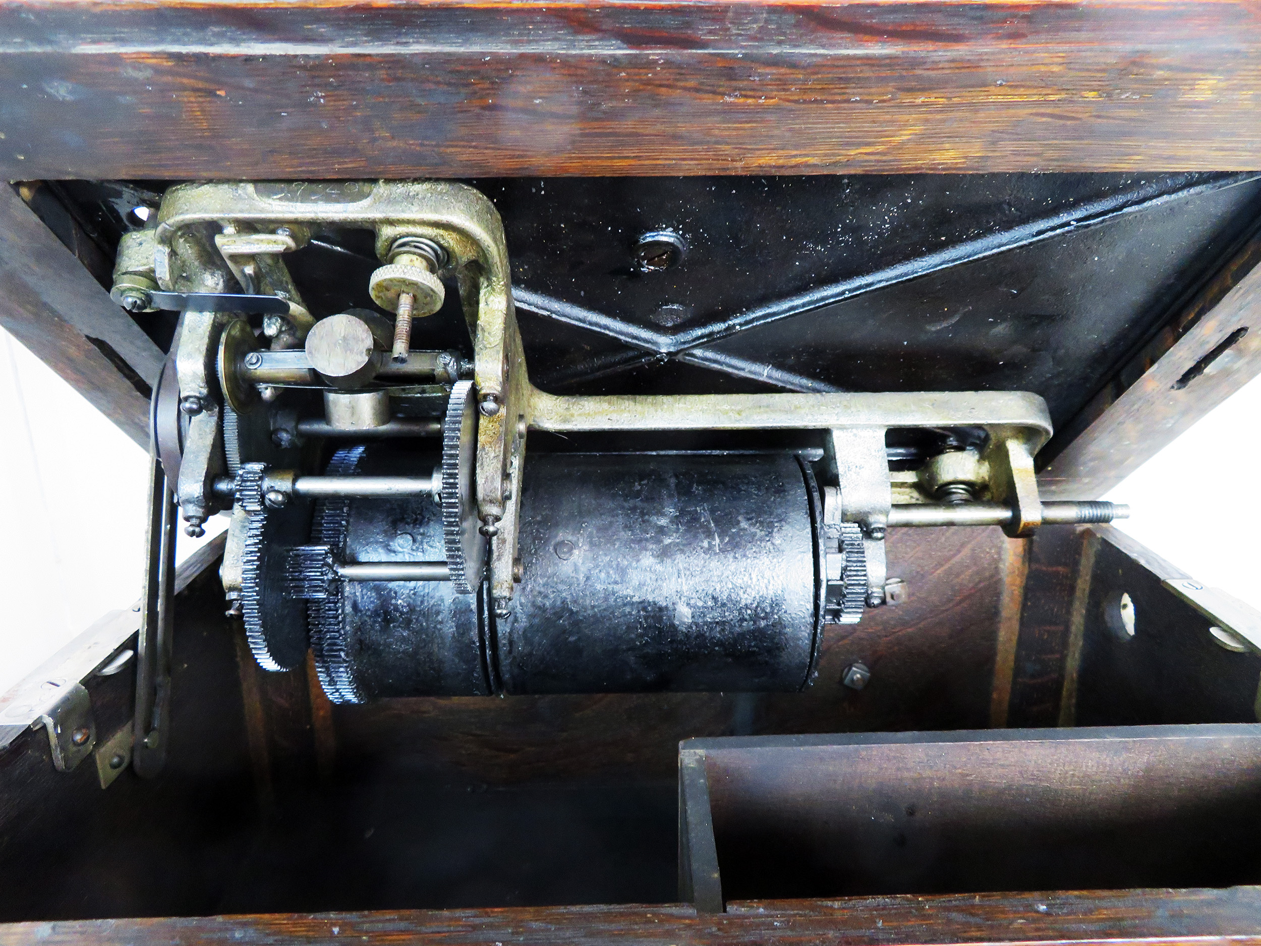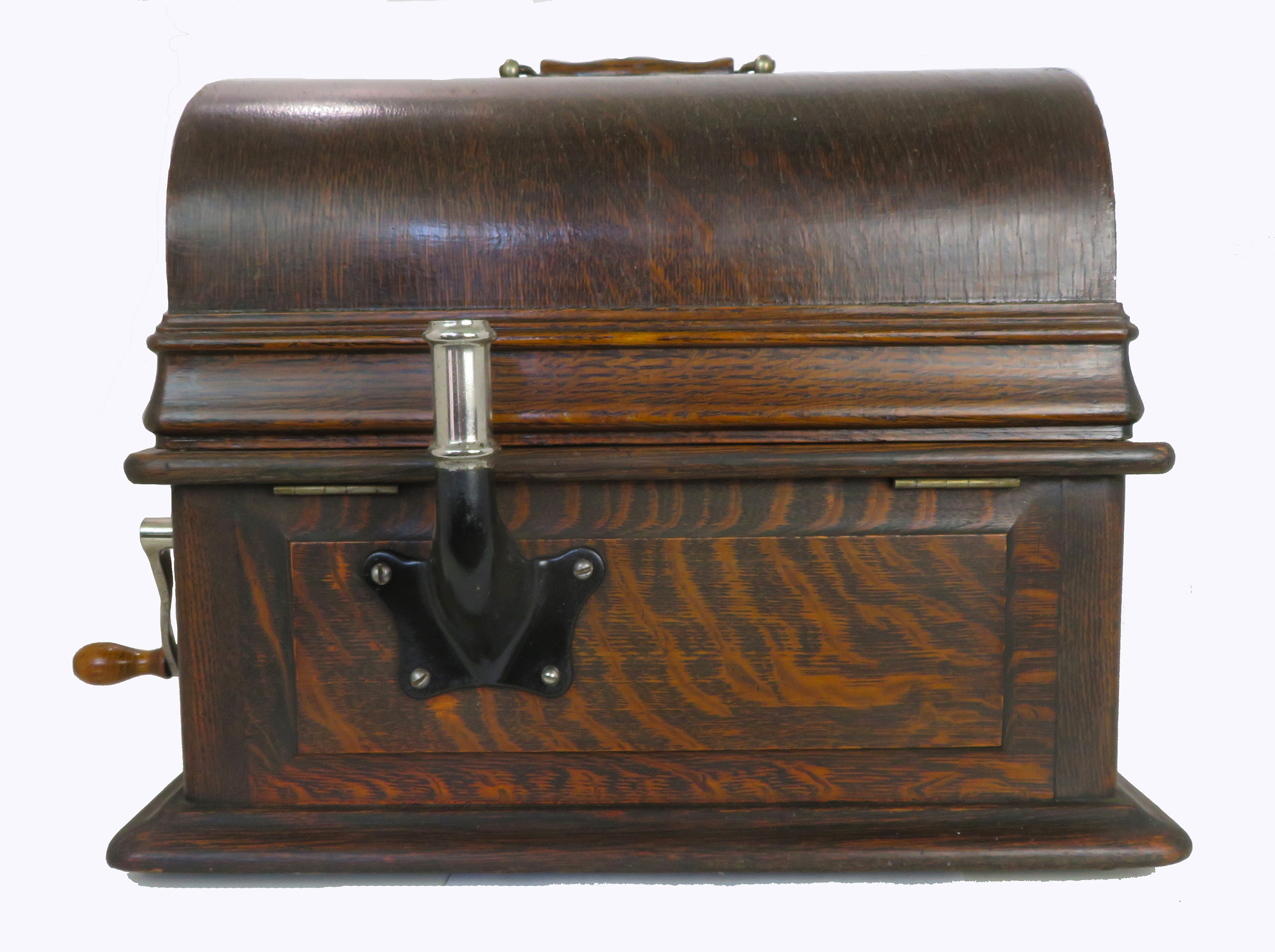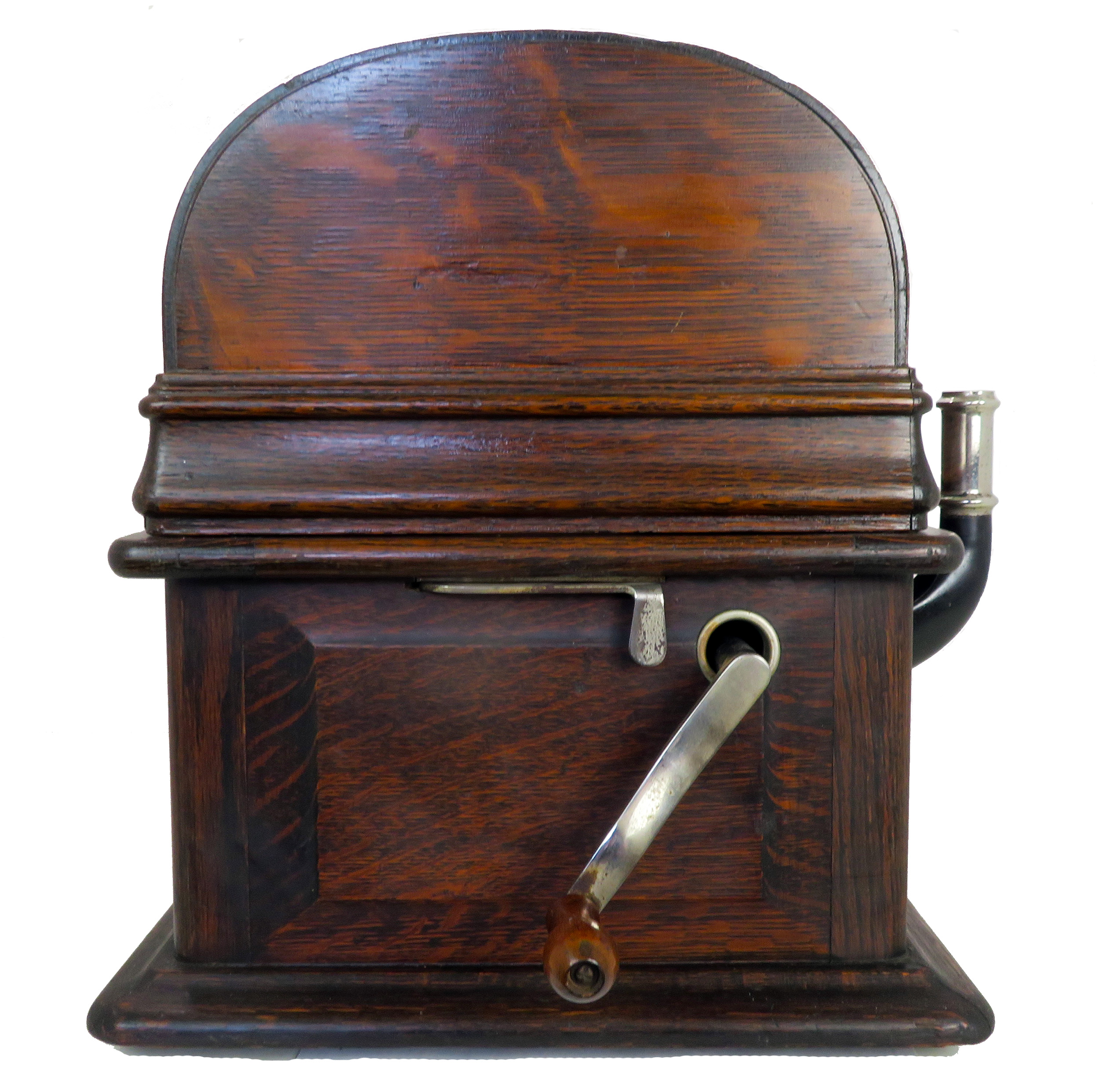Offering an original Edison Triumph 4-minute player with overhead carriage and rebuilt model B reproducer and cygnet back bracket. Serial No.51545. The phonograph is all original except the crank. All adjustments have been made for smooth operation. The stenciling is in average condition as pictured. The case and lid are solid with original finish. The back bracket is original and in great shape just waiting for your cygnet horn and crane. The reproducer had an expert solder repair to the top and is solid. The B reproducer is in very good shape and plays loud and clear.