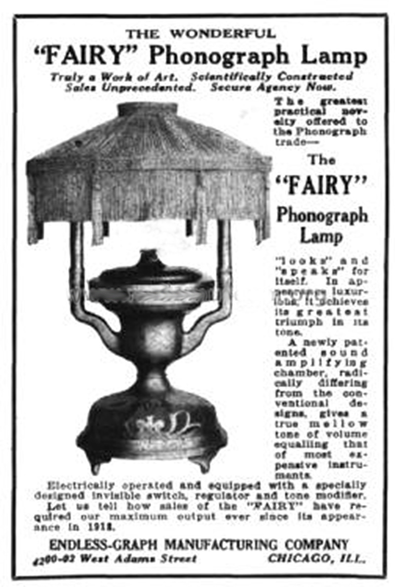 The Fairy Phonograph Lamp Company, later known as the Endlessgraph Company, was a Chicago-based manufacturer known for its unique combination of a phonograph and a lamp, often referred to as a "phonolamp". These ornate, furniture-like devices were produced around the 1920s and designed to be both visually appealing and functional, with a hidden phonograph mechanism inside. These are getting hard to find in operating condition.