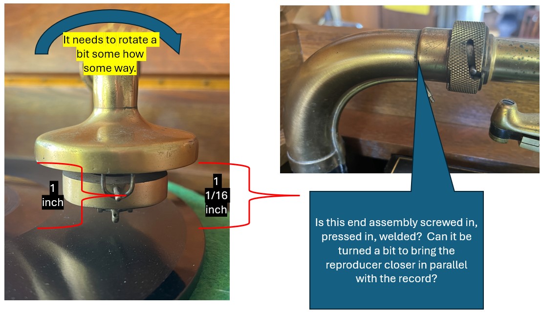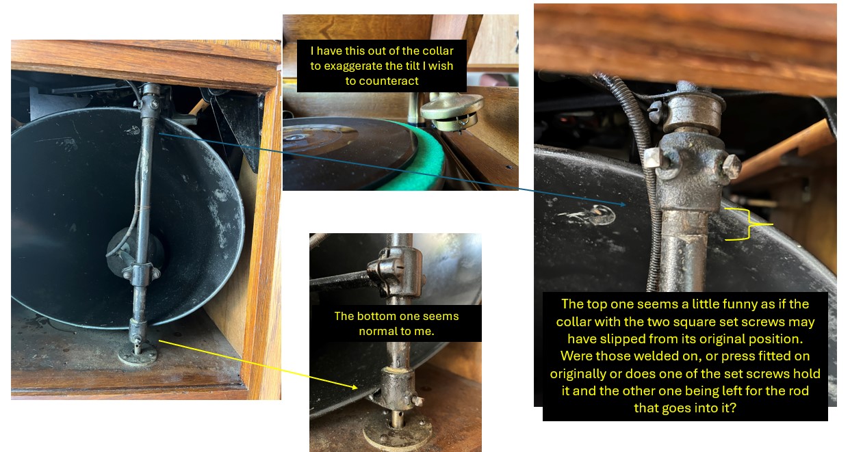 I recently acquired a nice Edison C-250. I have come to notice the reproducer is rotated a bit as you can see in the below photos. It is that way even with other reproducers so I know it's the horn collar that is not quite aligned properly and am wondering how it might be brought back so it is more parallel to the platter/record. Has anyone else ever faced this issue and if so what steps did you take to improve it? Or perhaps I simply need to leave well enough alone. Thoughts?