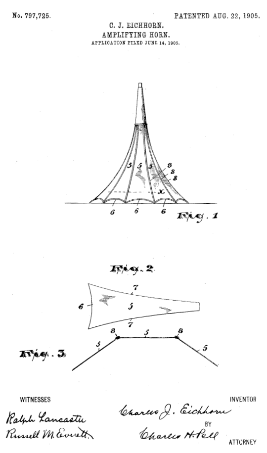 August 22, 1905: Charles Eichhorn was granted a U.S. patent (No.797,725) for an “Amplifying Horn.” This patent was assigned to the Tea Tray Company, and featured the distinctive concave petals commonly associated with the company’s horns. When Edison began supplying large flower horns with its Phonographs in October 1907, they were manufactured to the specifications of this patent.