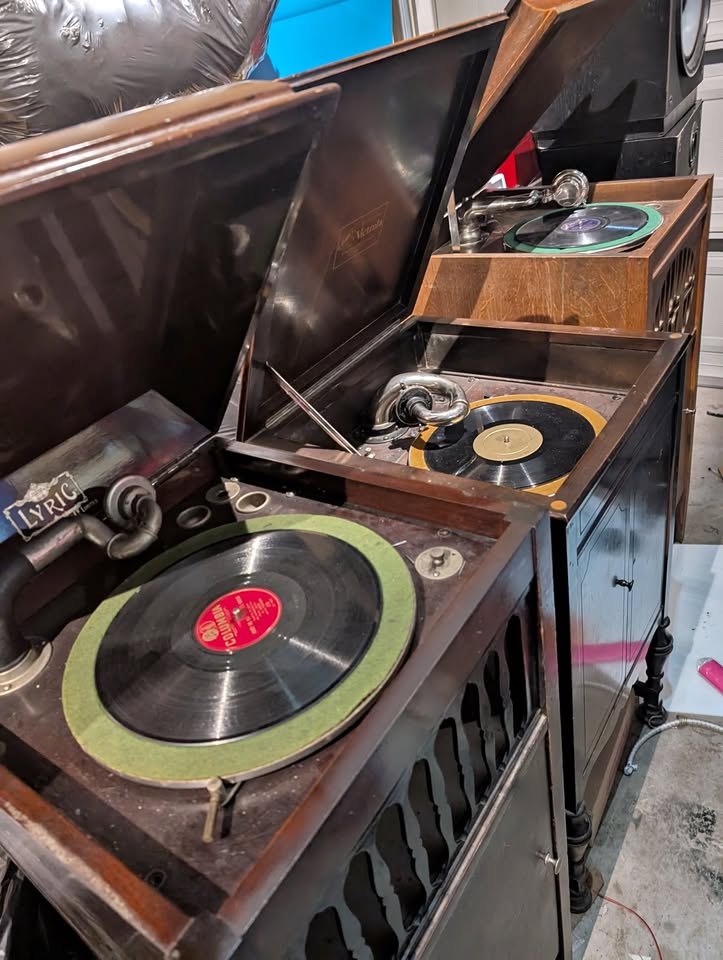 3 Machines, Victor, Brunswick, and Lyric upright cabinets. All claimed to be in good working order. Some records included, I think. One low price for all three -- must take all three.