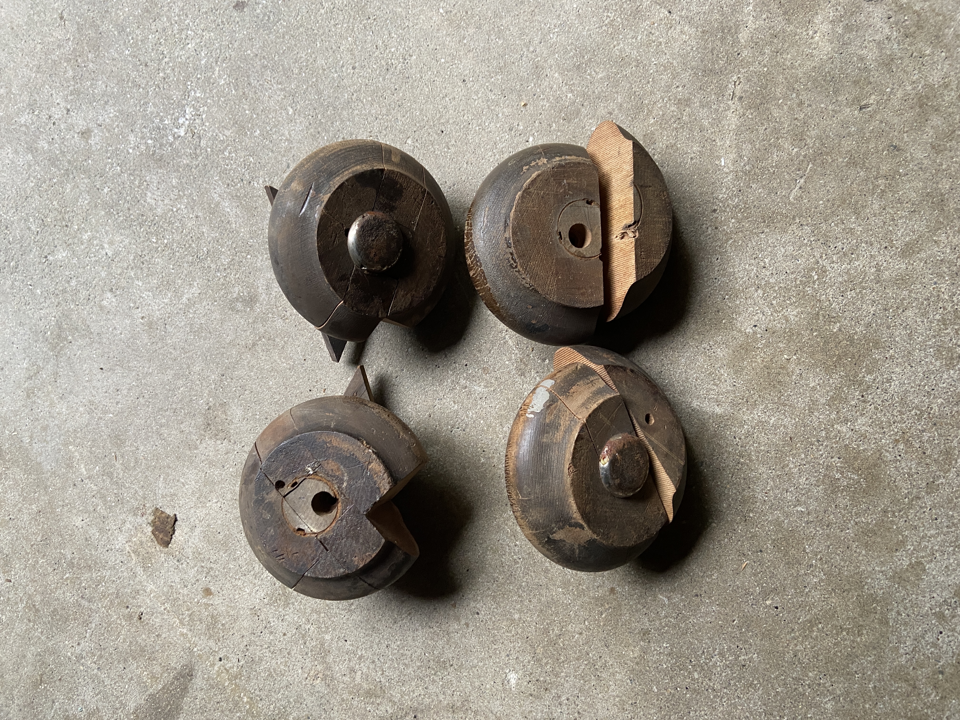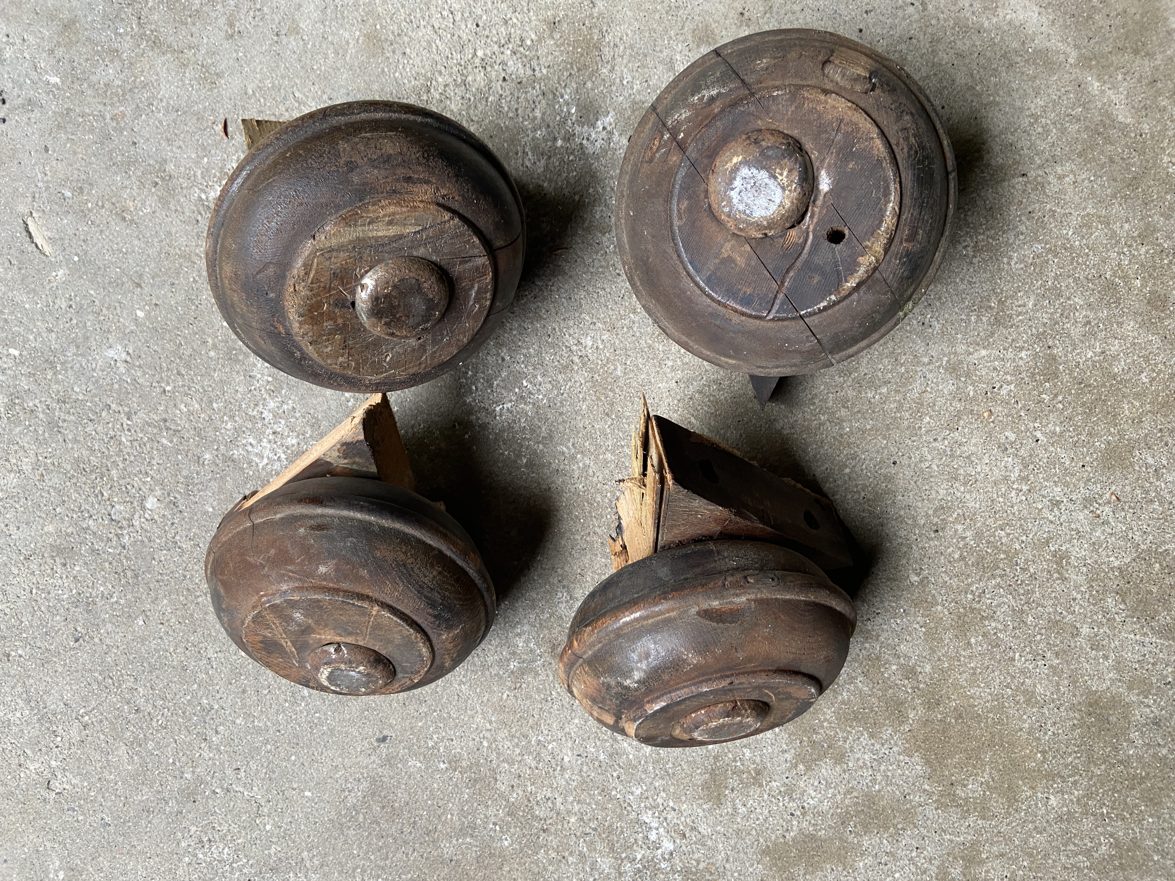 Have two pairs of feet for sale. The set with the chunk missing is $20. The set that is complete is $35. These have holes for three small dowels but can be used on a Credenza in a pinch. Contact me if you are looking for less than a set on an actual large dowel Credenza foot.