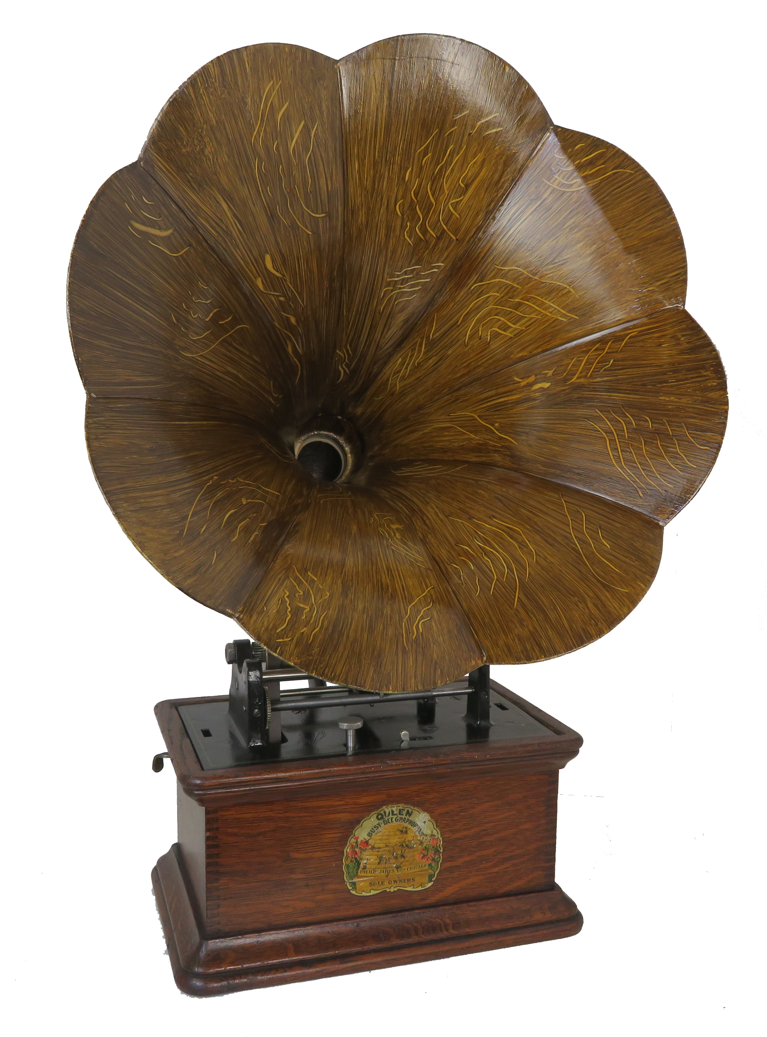 This example is in excellent restored condition with original case finish and decal with a protective clear coat. The bedplate finish is good except for some pitting. The machine's nickel plating on all of the parts is in good shape with some plating loss on the mandrel. The only exception is the crank finish (which is mostly gone). All gears are sharp showing minimal wear. Springs are good. The original 2-minute reproducer has a new rubber gasket and still has the original stepped diaphragm and a stylus which blasts a bit due to what may be a slight flat spot. This stylus should be turned for better clarity. The machine runs well, and the reproducer has good volume. You may not see another like this.