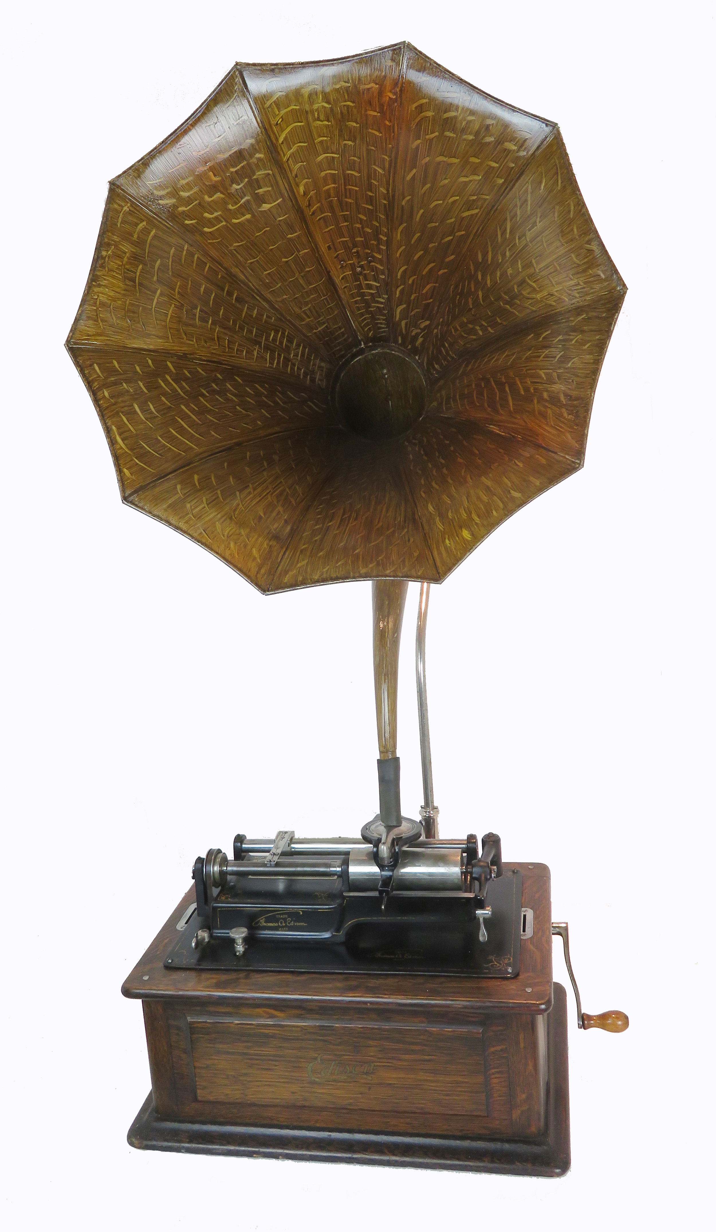 Offering an original Edison Cygnet 10 panel horn that has been given an oak faux finish almost identical to original. This is not a reproduction horn but a well-cared for original. This is a great way to dress up your Edison cylinder phonograph display with a unique and beautiful horn. The Edison Triumph is shown only for display purposes and not part of this sale.