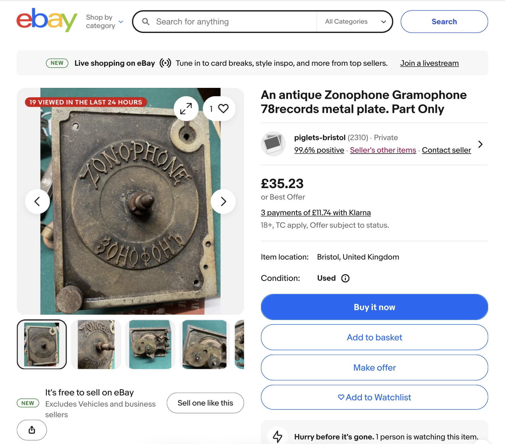 It sold quickly. Actually it was cheap enough to be a paperweight/door stop. Or good as a display item with the 2 interesting Zonophone scripts, these normally being concealed by the turntable.