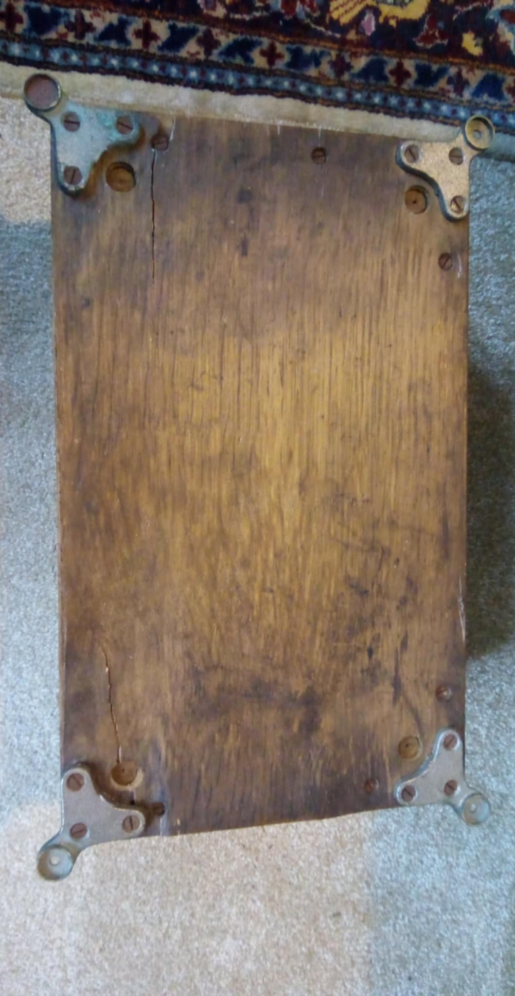 Anyway, on to the machine itself. It is not complete, though fortunately many of the coin-specific parts are actually present. When it arrived to me it was the case, top part with the glass, signboard, bedplate and frame and most of the upper works. I have since added parts, both original and modern, to help complete the machine. What I have added are an original tiz-it elbow, so that I can mount my original horn there (sure, it isn't the original coin-op nickel horn and elbow, but still looks good), an original replacement Type A motor (serial number 200270, a very low number for these) to fill in most of the missing parts (I have already transferred some parts over), some screws and springs for the upper works, a plunger-rod for the upper works (needs shortening and a point on one end), replacement glass for the signboard, an original floating reproducer (needs a rebuild), and, of course, a nice original record. I already have a pdf for a new marquee for the signboard, which I will be taking to a local copy shop to print out on quality paper/card. The crank in the photos is an original Edison Standard crank, but is there for display only at present. I also have a pair of vintage brass hinges on the way to connect the case base to lid.