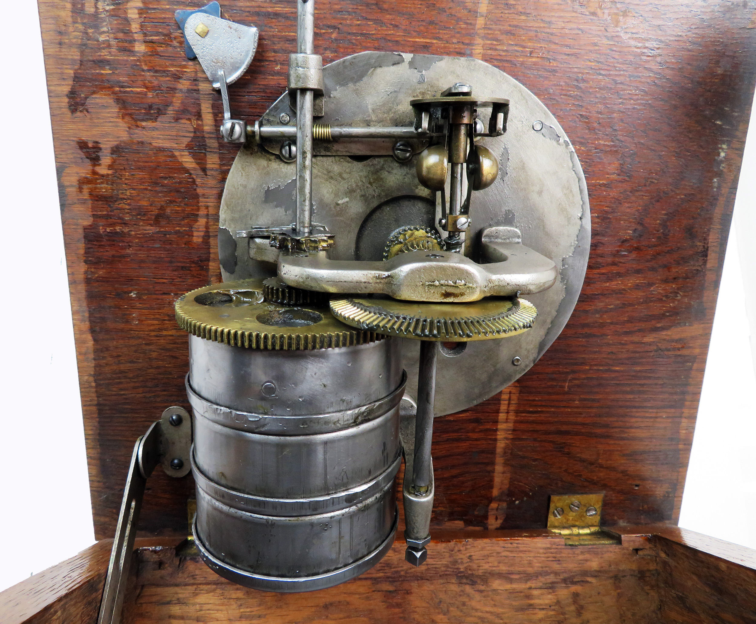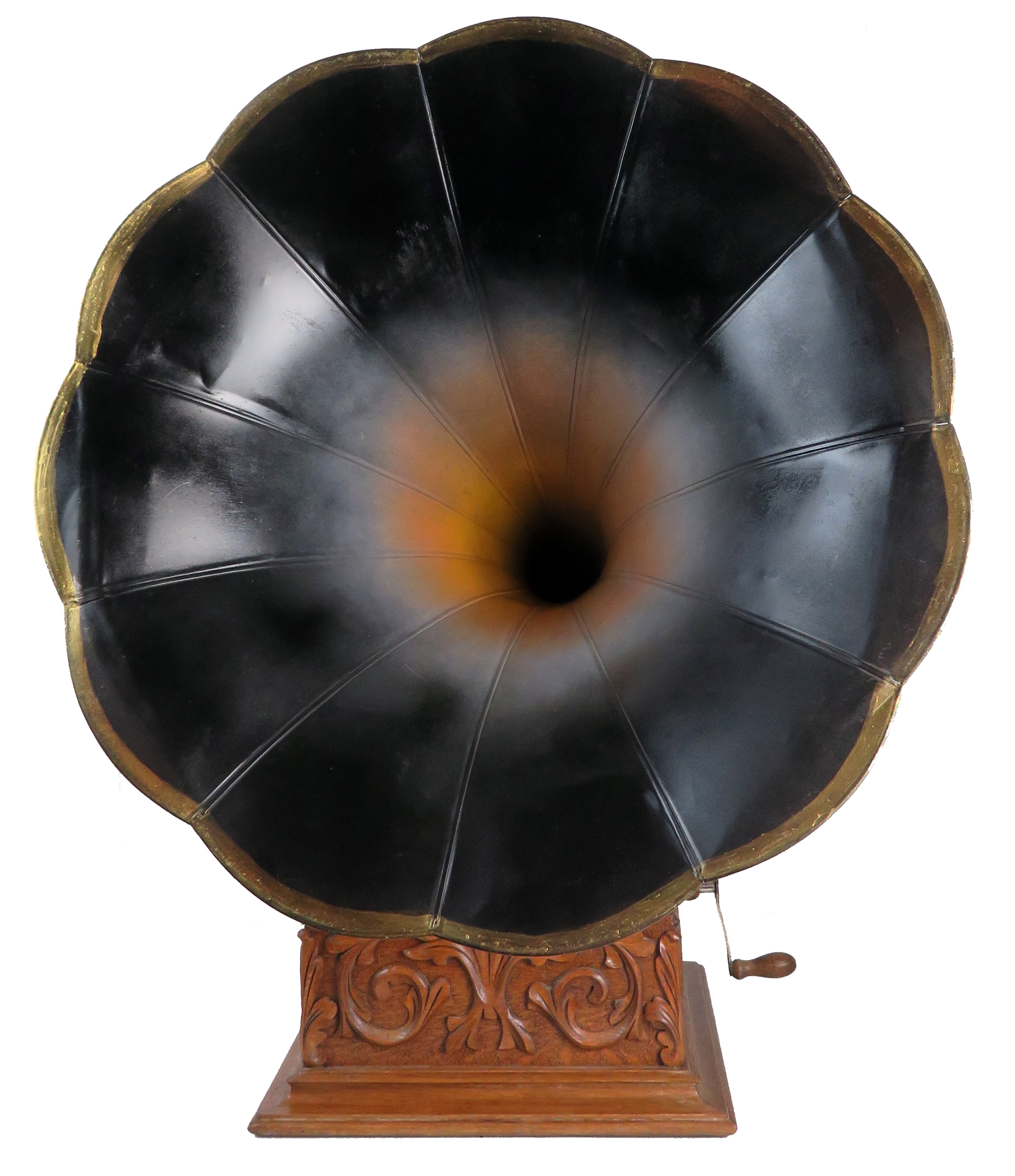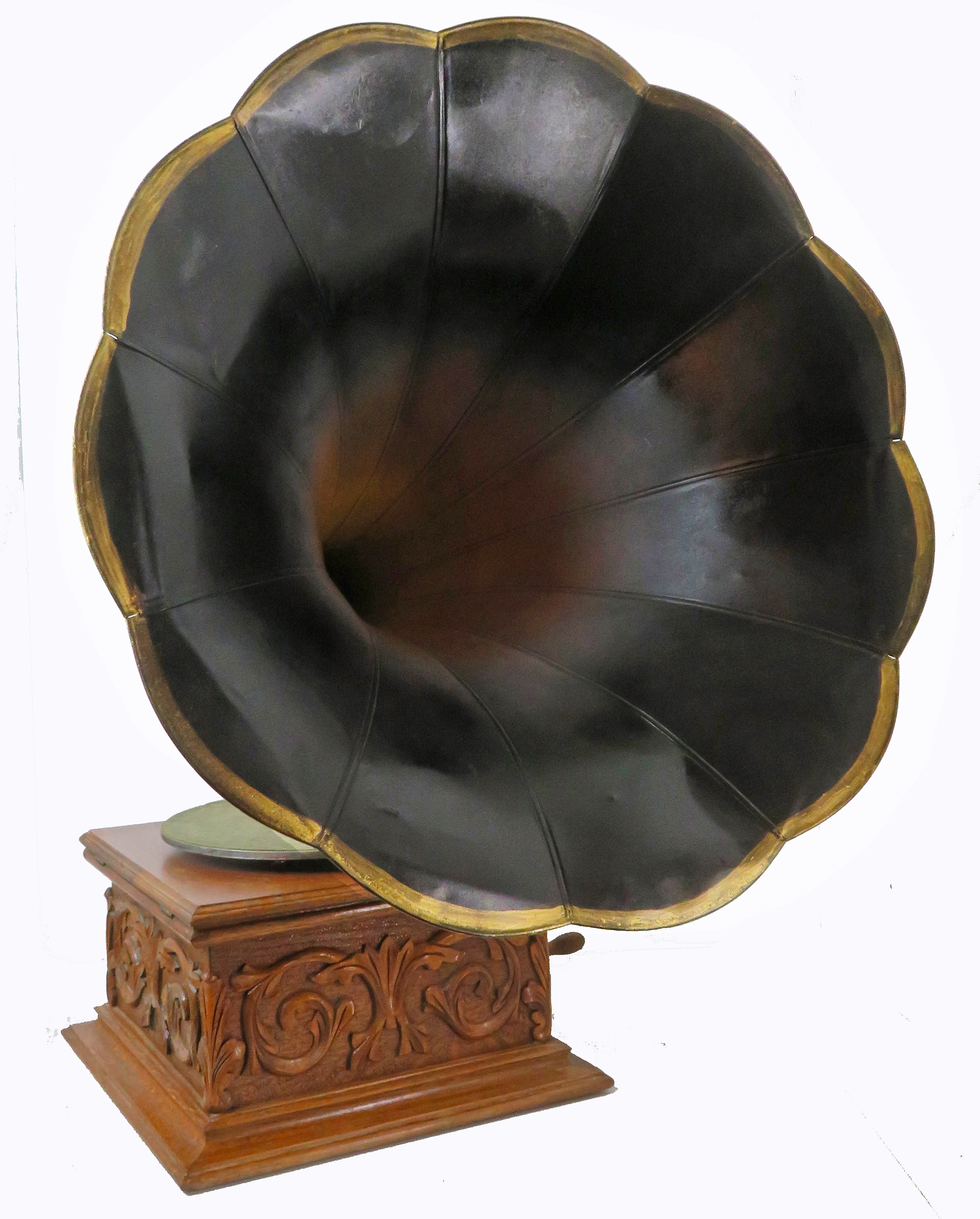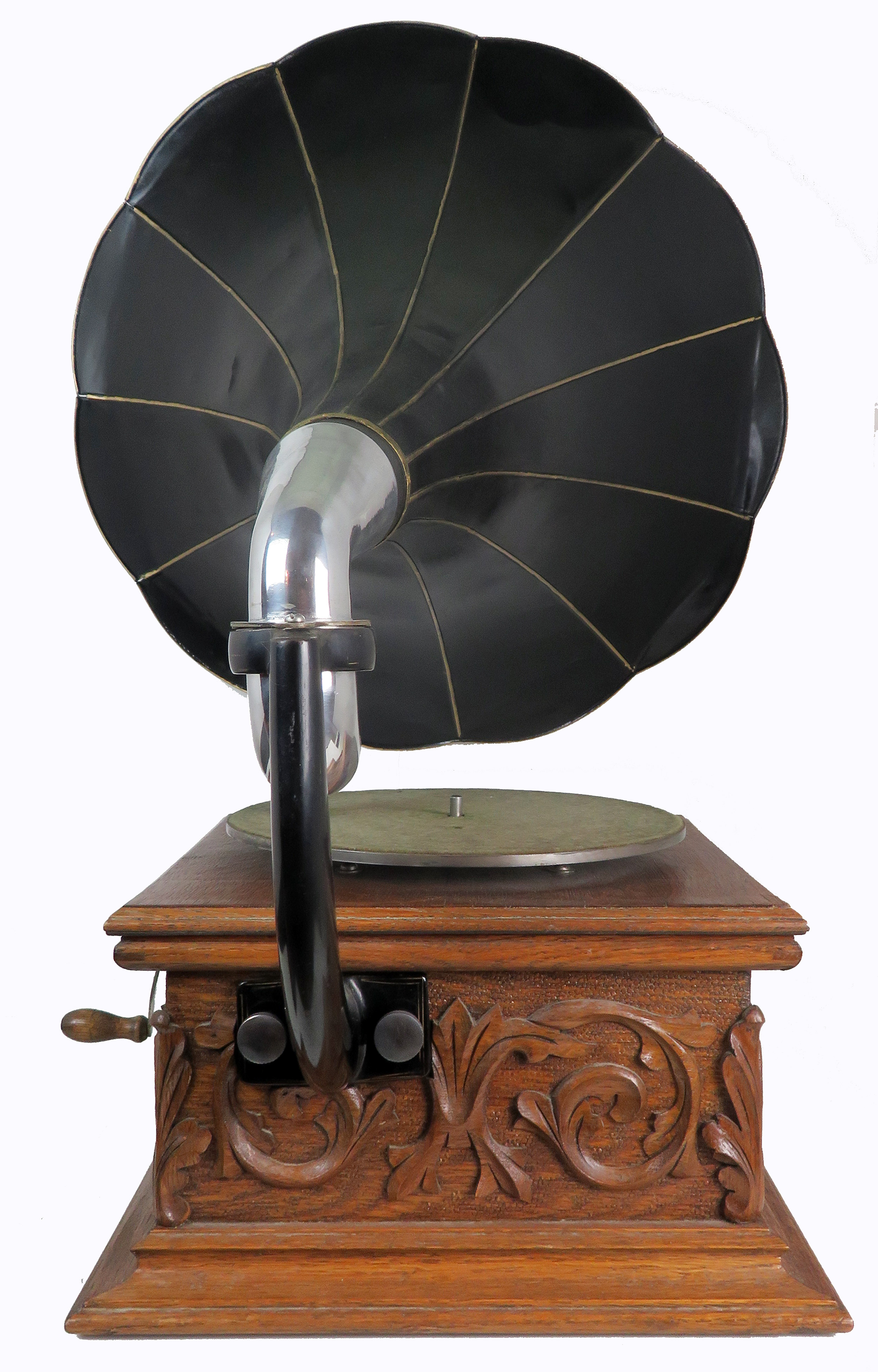 Offering an original Sousa Talk-O-Phone. This phonograph is considered by many to be one of the fanciest cases ever produced by an American phonograph company. This one is an excellent example with all carvings sharp and intact. This has the 3-spring motor which has been cleaned and regreased. This phonograph was restored years ago and is in peak operating condition. The horn is nearly perfect retaining its original paint. It measures 22.5” wide x 24” long. The horn has the handy Victor style button to lock-in elbow so you can use other horns if you like. This model also has the exceptionally rare Talk-O-Phone rear mount back bracket and arm. Sousa's are most often found as front mount phonographs which makes this unique. The reproducer has been rebuilt and plays loud and clear.
