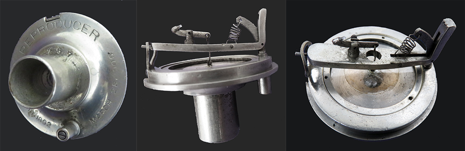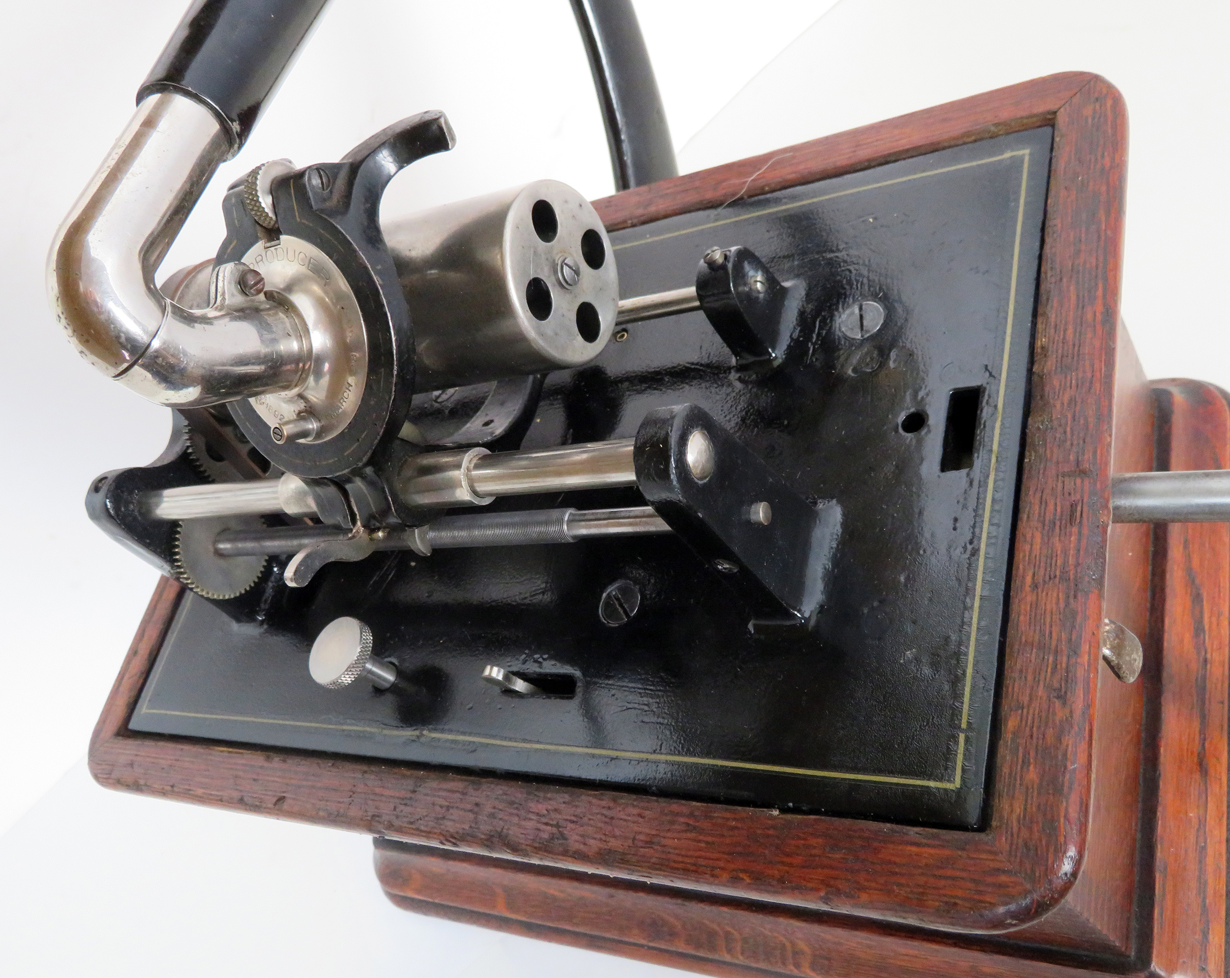 This example is in excellent restored condition with original case finish and decal with a protective clear coat. The bedplate finish is good except for some pitting. The machine's nickel plating on all of the parts is in good shape with some plating loss on the mandrel. The only exception is the crank finish (which is mostly gone). All gears are sharp showing minimal wear. The original 2-minute reproducer has a new rubber gasket and still has the original stepped diaphragm and a stylus which is a bit raspy due to what may be a flat spot. This stylus should be turned for better clarity. Springs are good. The machine runs well, and the reproducer has good volume.