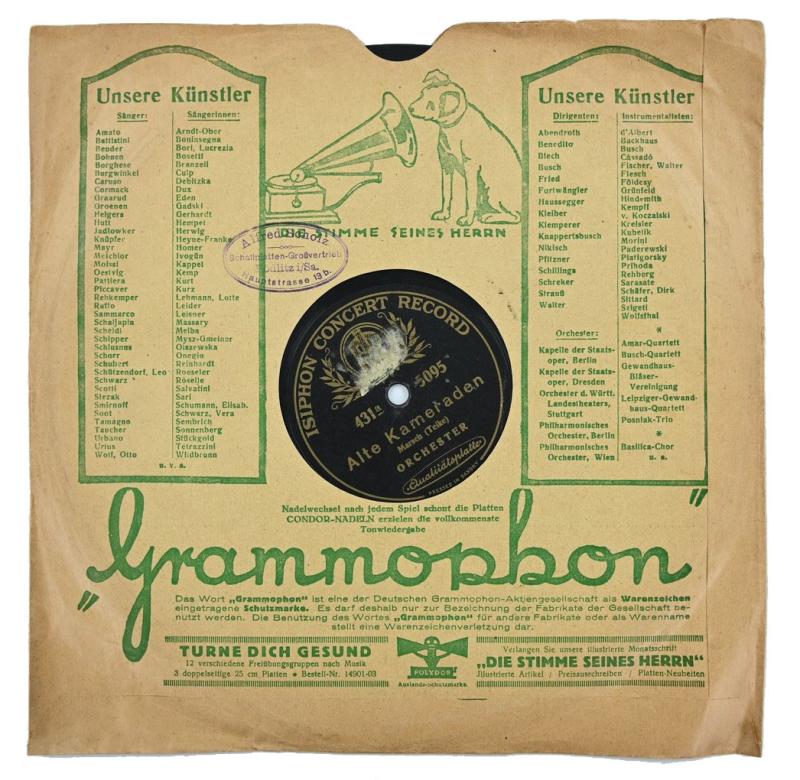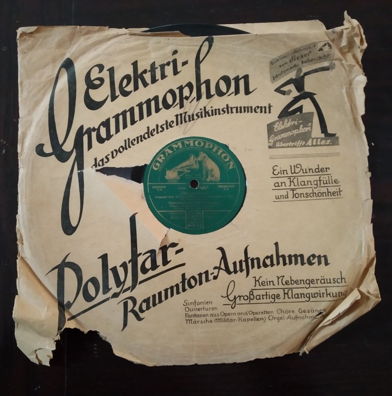 Years ago I acquired a full box of DGAG 12" 1925-1930 record sleeves from a German colleague collector. They are all in beige paper with green ink. They are very interesting, full of advertising, and the Elektri-Grammophon brand appears in many of them, as does the Polydor brand, and the curious US Brunswick-DGAG agreement era logo of the navy soldier waving two flags in his arms... Pity that all advertising is text and logos, no machines depicted nor described.