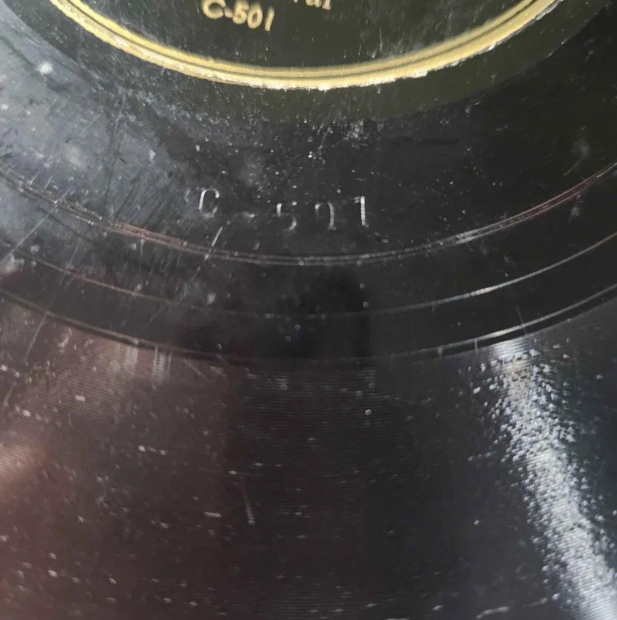 These all seem to add up to them all being pressed by RCA Victor, slightly differing info but I doubt that conformity would be their(RCA Victor's) number one concern (considering the differing label types, these could have also been made at different times, when RCA Victor would be using different ways of marking records.). There is an anomaly in this label type though. This label features a "C-501" stamp (Which both increases to 502 on the B-side & is not the label listed matrix number), and a very faint but definitely visible backwards S marking (too faint to capture). I'm wondering if this is them going to a different company, I did just mention RCA Victor probably not caring much about conformity, but this seems very far off. Different font, different run-out groove style, & different markings. Probably most likely solution is that this one is a master from a different company, but I don't know enough to identify that.