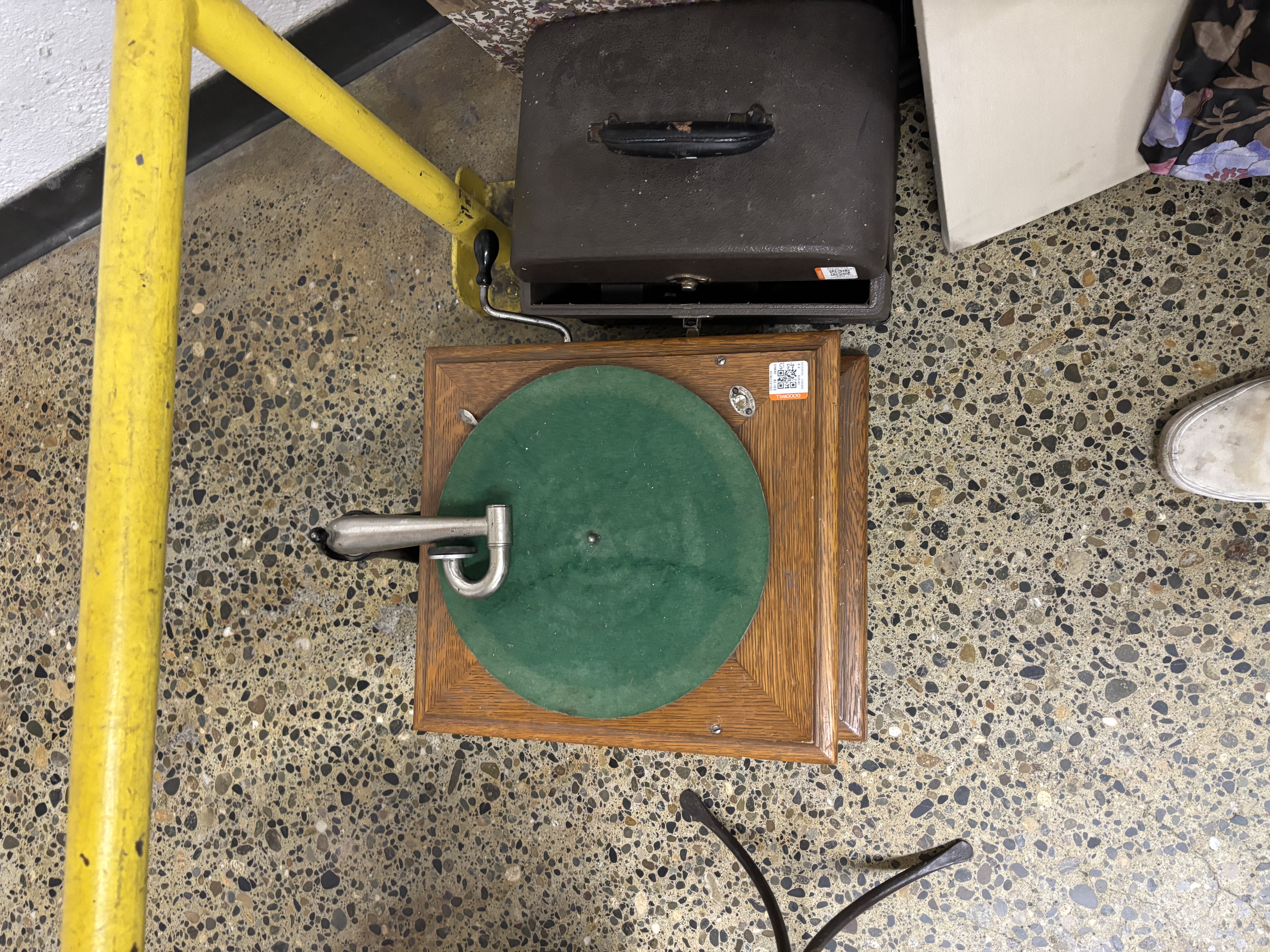 Well, it happened. Purchasing one phonograph inevitably leads to another. In this case, I spotted a Victrola VV-VI at the local Goodwill while out with a friend. We were bemoaning the lack of anything interesting when I spotted this little guy sitting on the floor in the corner, amongst discarded kitchen utensils, torn up player piano rolls, and broken camera flashes. The case and brightwork looked clean enough, but the reproducer was missing, the platter seemed frozen, and a turn of the crank resulted in a horrendous crashing noise. Classic. Seeing as it was only $40, and remembering that I had another friend who always wanted an acoustic phonograph, I impulsively took a gamble. Seemed like a great opportunity to learn how to work on these machines, and make a good friend very happy.