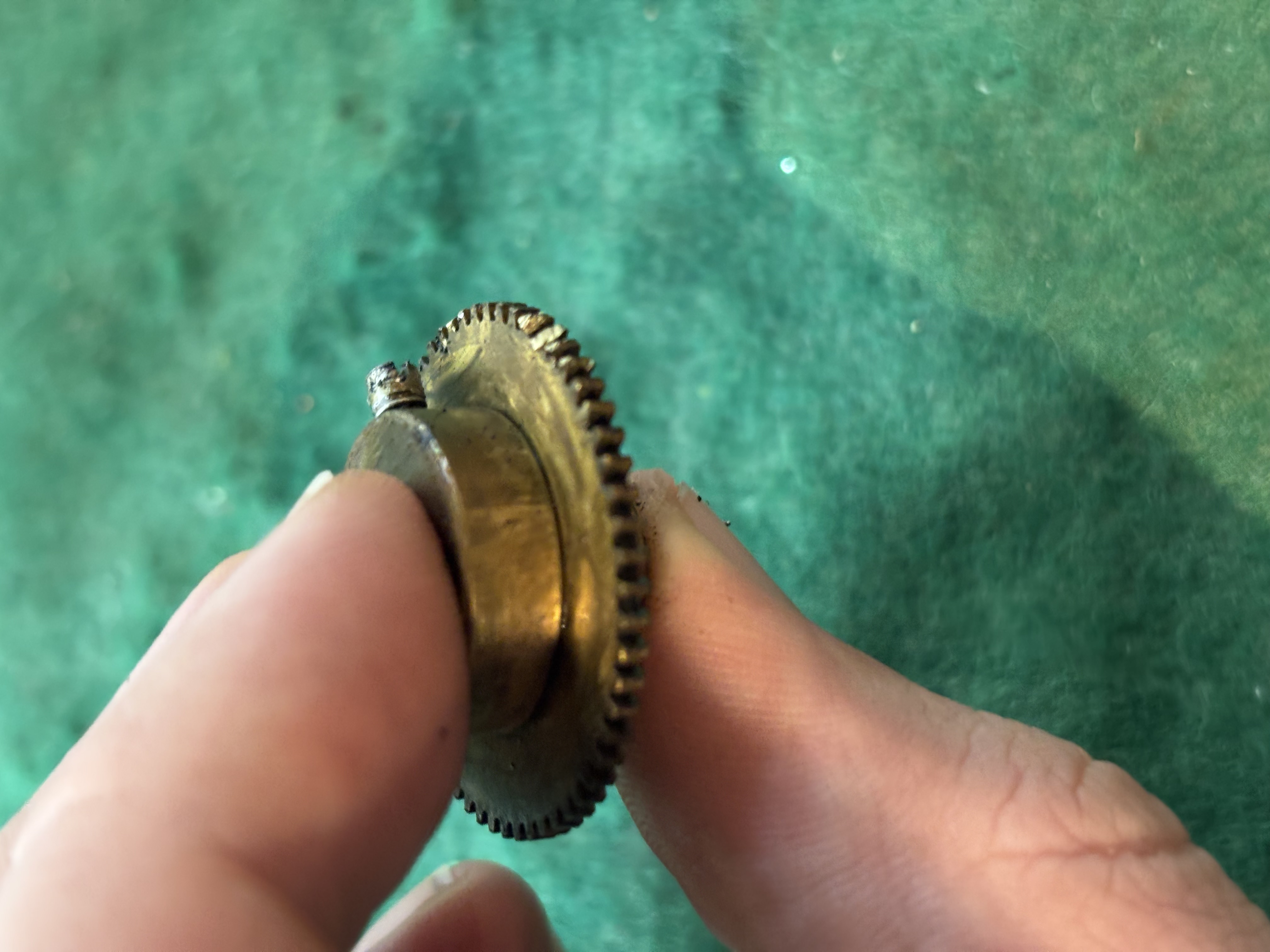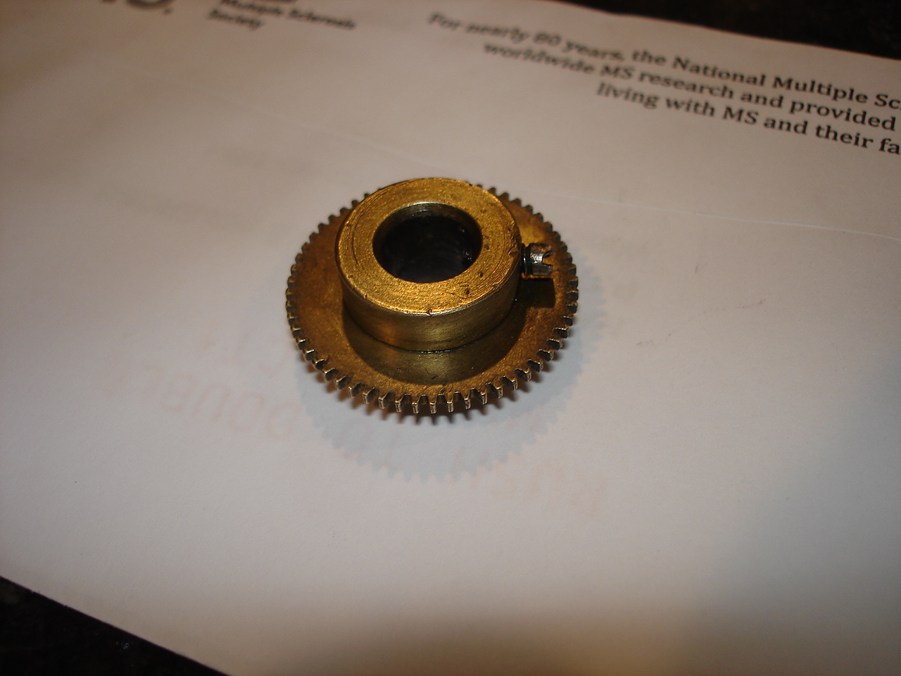 After getting it home, I started to take apart the motor, and my heart began to plummet. The teeth on the brass governor gear are chewed up in one spot, probably enough to jam the worm gear.