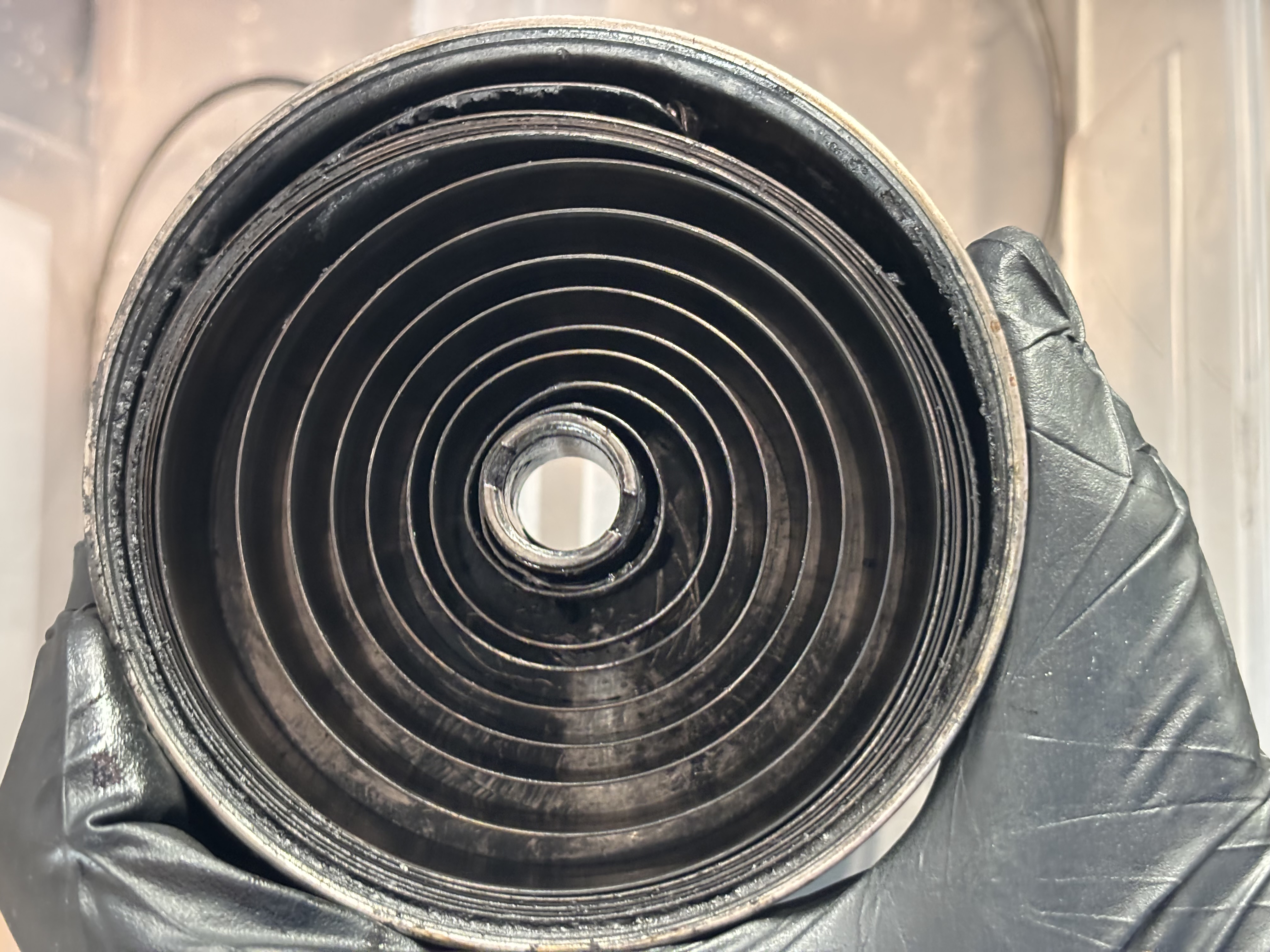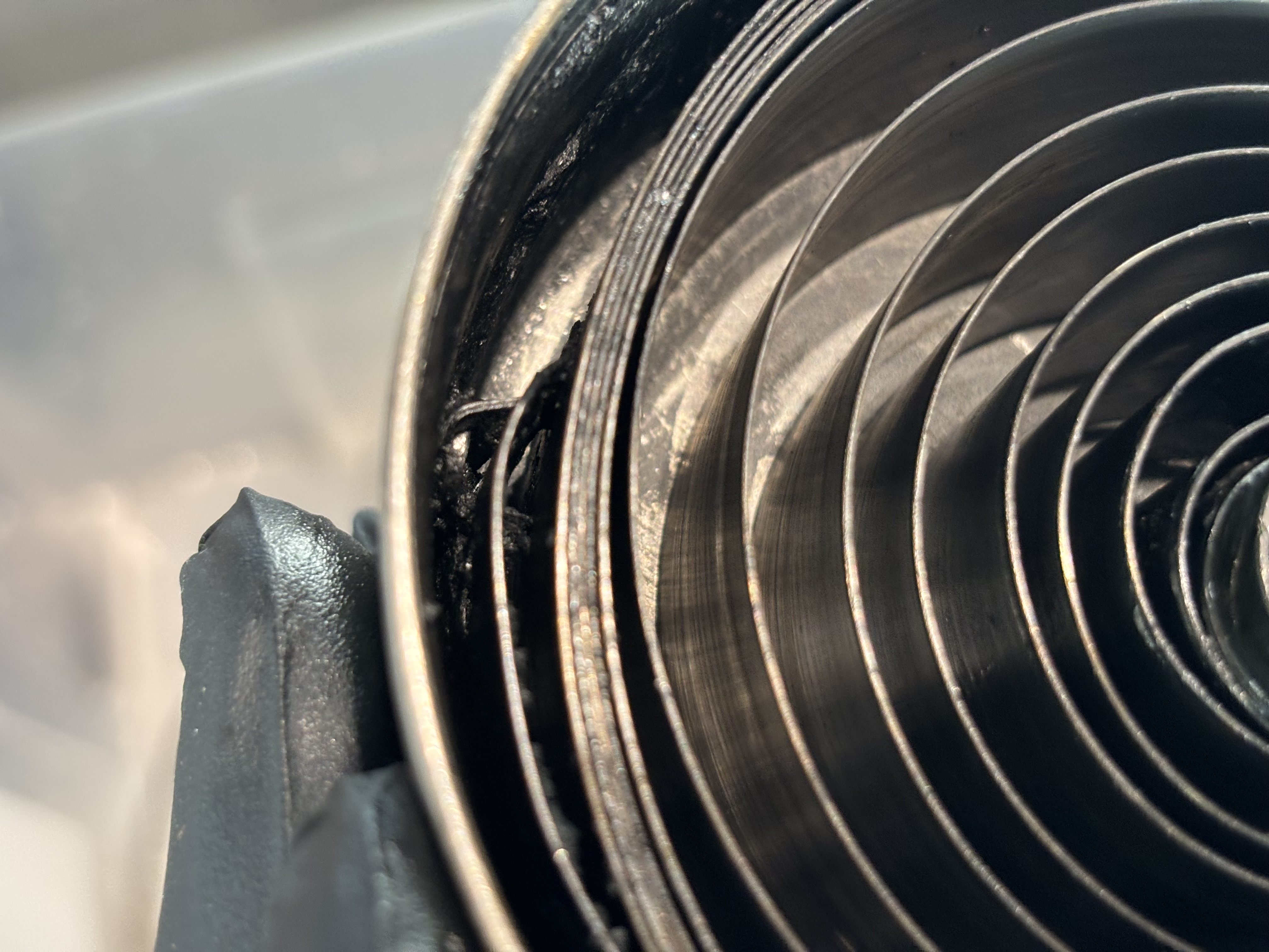 Opening up the first barrel revealed that the spring had been cut short and welded? to the inner edge of the barrel, evidently someone’s failed attempt at a backyard broken spring repair. It’s my understanding that the spring is supposed to be hooked around a sort of small lip/arbor riveted to the barrel, so I’m hoping that’s intact and the barrel’s okay. I’ve yet to attempt removing the spring, though.