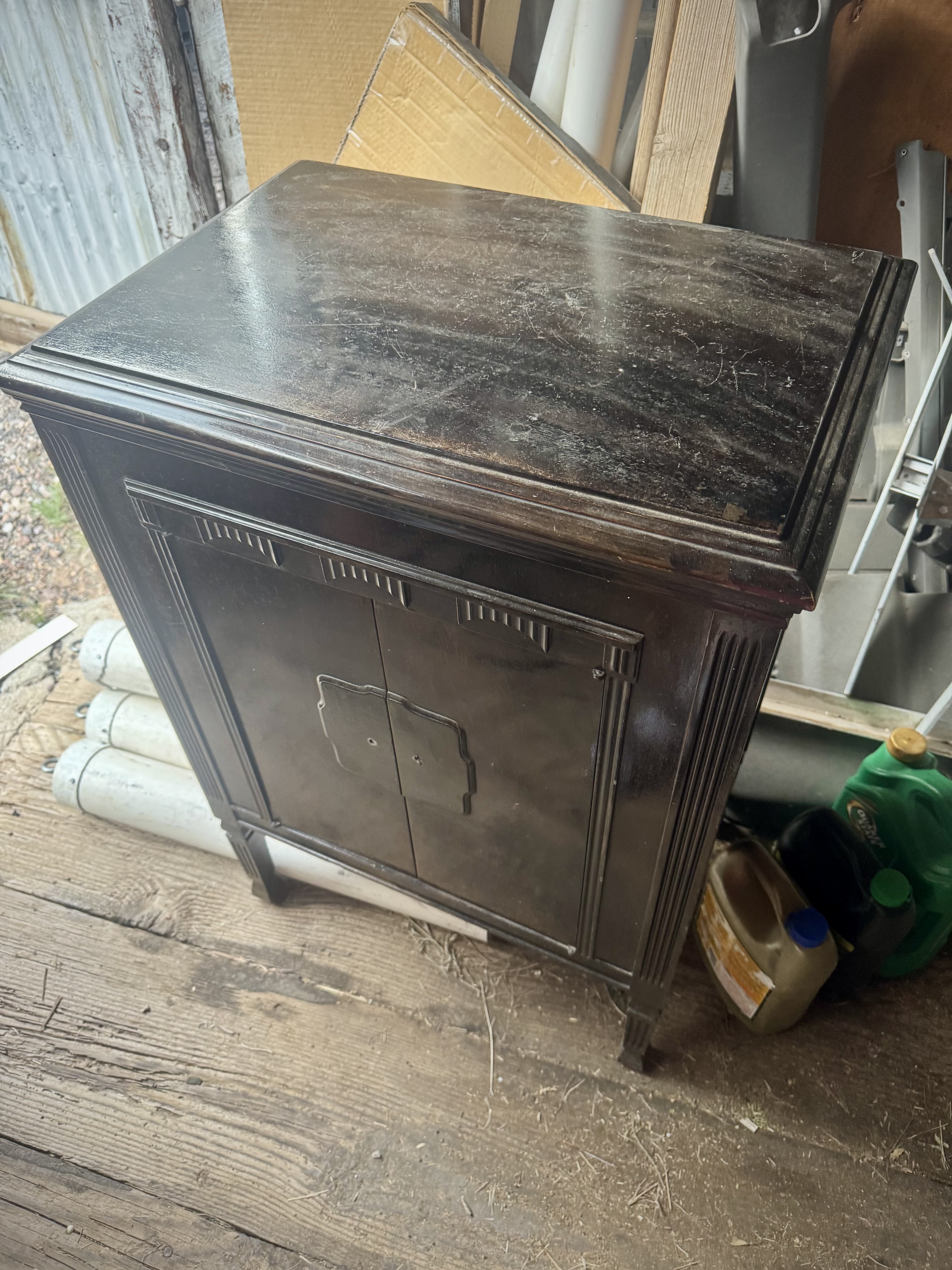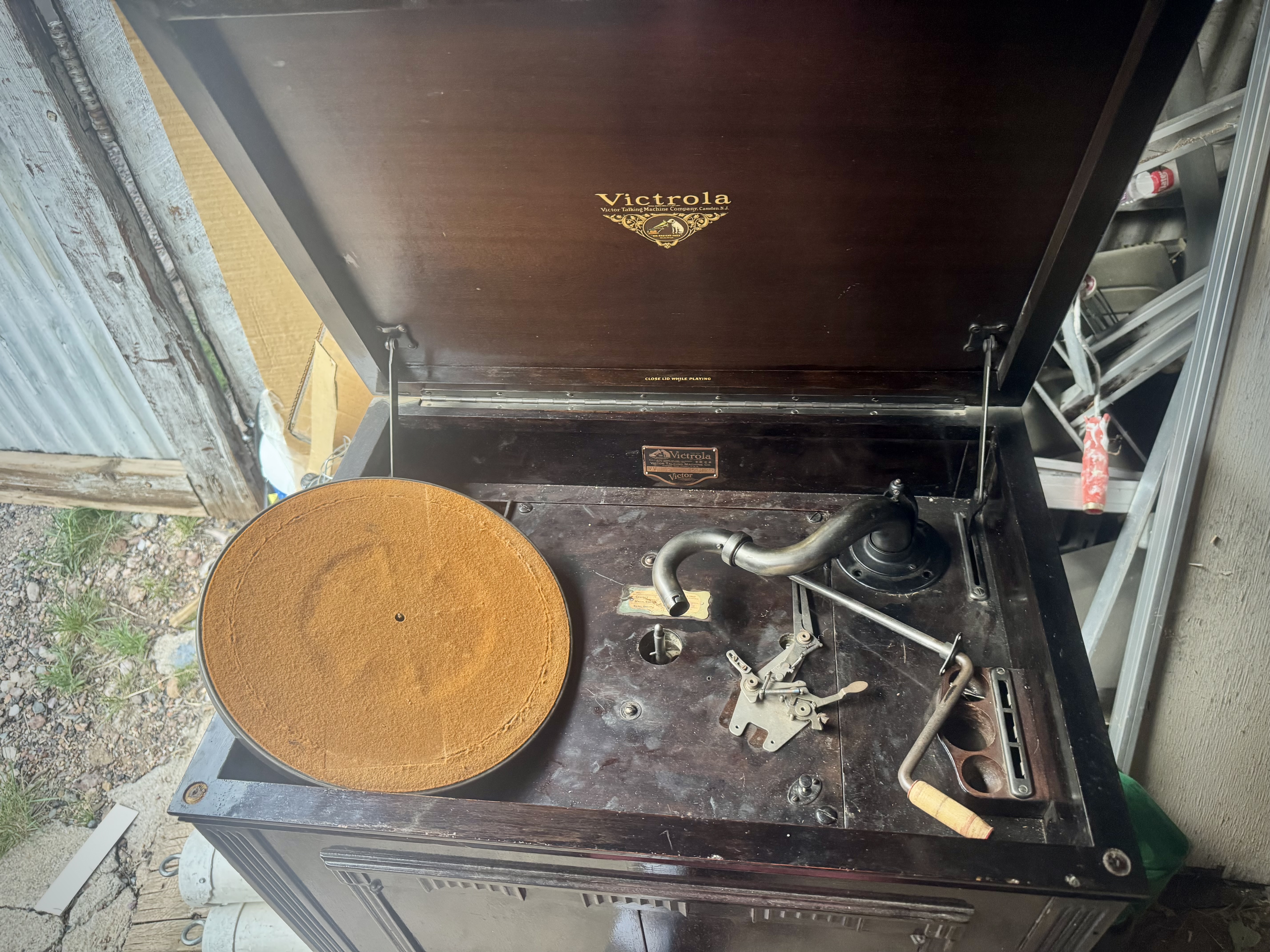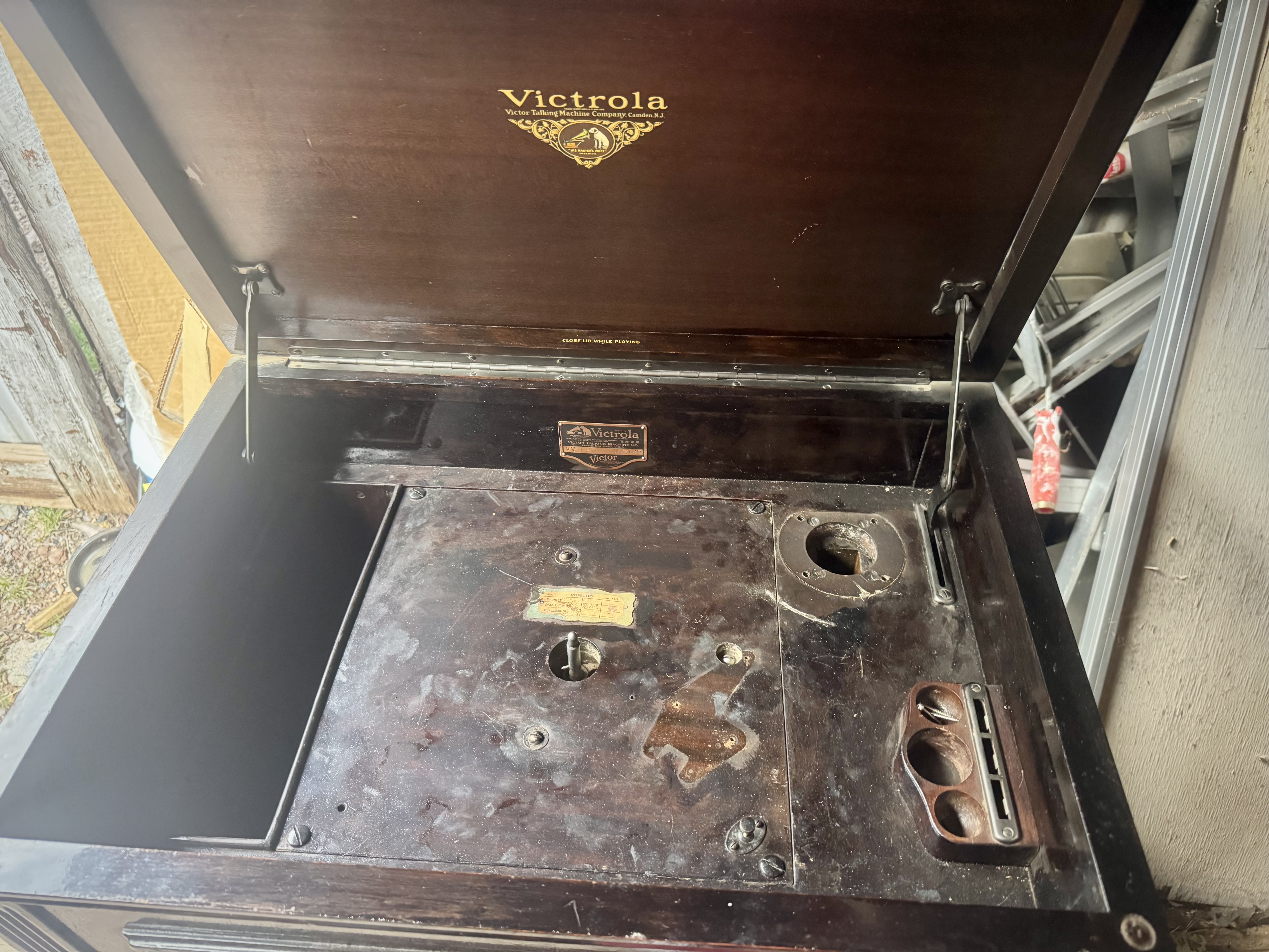 Here are some photos. The cabinet door knobs are missing. No reproducer. One of the small springs in the brake is sprung. Weird knob on crank. Pivot bracket is good. I couldn’t open the doors, but the grille cloth is good as I recall.