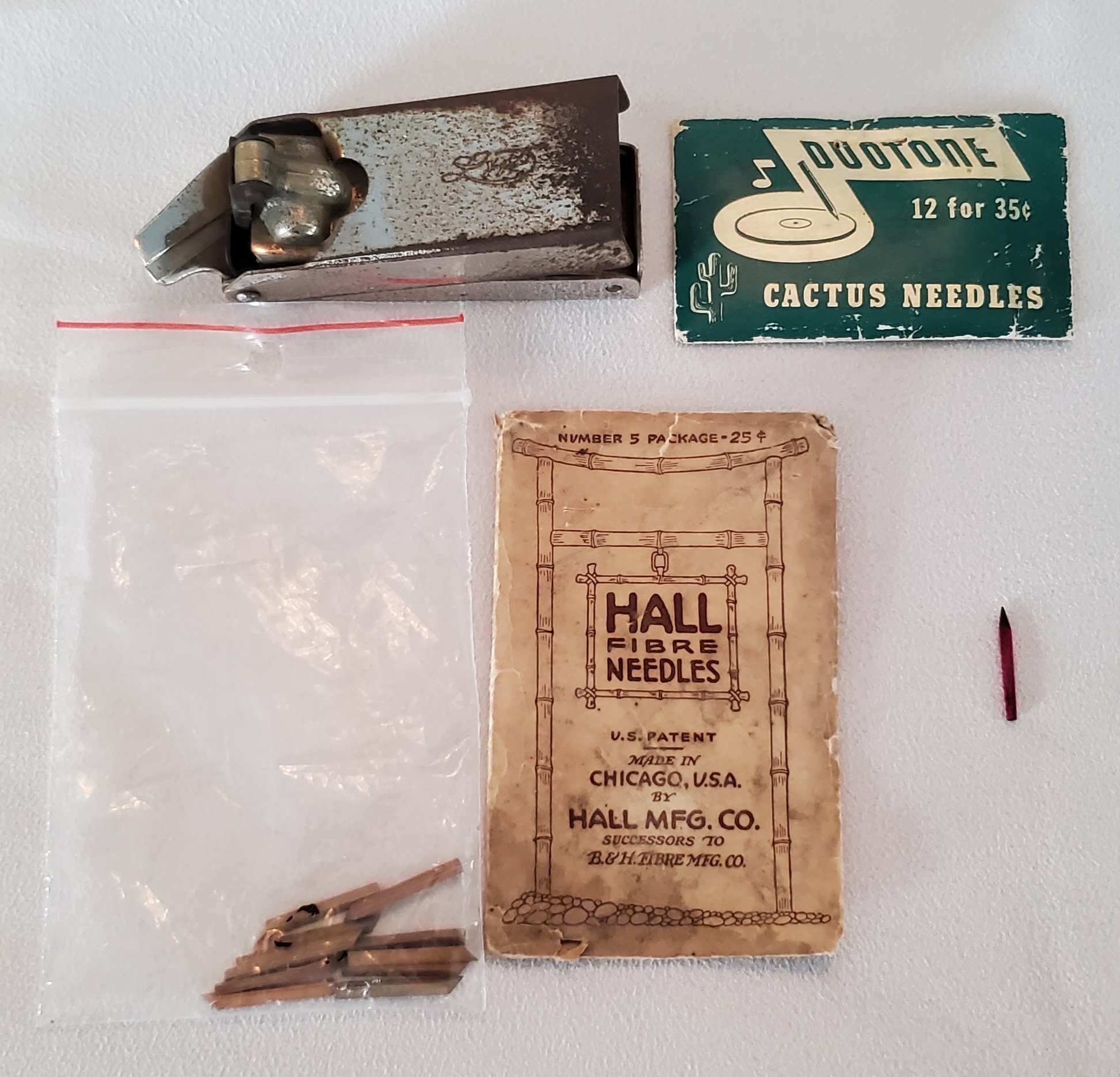 I've only been into victrola's for a few years now and can't get enough of them! I started out with a simple VV-100 and graduated to a Credenza and a VE 8-35x. A couple of years ago, I got a large collection of several thousand records that I'm still going through and putting into inventory. I have also acquired some rare and expensive records that I cannot bring myself to putting a steel needle on, so I bought some cactus and fiber needles. I also have an old rusty sharpener that I have yet to figure out and use. In the included picture of this email is: the unopened packet of cactus needles, the triangular needles, the cutter, and the pink looking cactus needle that I've used dozens of times (it's still going and I turn it a quarter of a turn inside the soundbox between plays. It can't hurt the record doing this, correct?). Yes, I read the BCN FaQ.